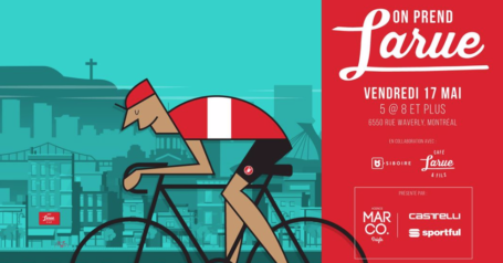 Le 17 mai prochain, y’a un bel événement à Montréal que vous ne voudrez pas rater: On prend Larue, ou le lancement du nouveau café Larue & Fils et du showroom Castelli, Sportful et Karpos, marques désormais représentées par mon ami Marc-André Daigle.