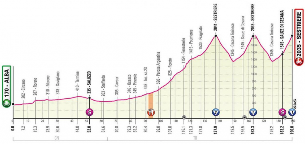 Mais il faudra avant cela affronter l’étape de samedi sur Sestrières, certes moins difficile qu’originalement prévue depuis que la France a interdit au Giro de passer à Briançon, Covid-19 oblige. L’étape a été redessinée, on fera trois boucles autour de Sestrières, avec chaque fois une ascension de 6 bornes à 7,5% de moyenne. Probablement pas assez sélective pour faire une réelle différence, les coureurs joueront sans doute les bonifications à l’arrivée.