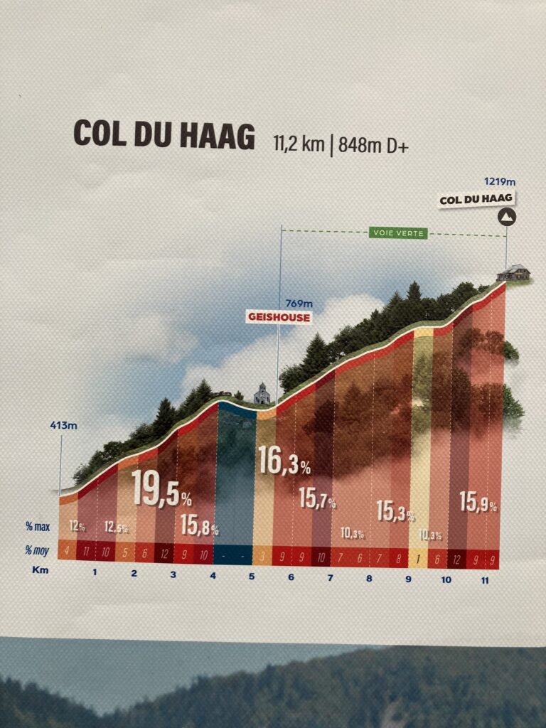 Pour en revenir au col du Haag, fait pendant l’été 2023. Dans mon souvenir moins dur qu’indiqué sur ce graphique car pas mal irrégulier, donc de nombreux passages pour se relancer. Bien profiter du dernier replat par contre, car effectivement les 2 derniers km sont rudes. La barrière à la sortie de Geishouse était descendue/fermée ce qui m’a très sûrement empêché d’aller chercher le KOM 🙂