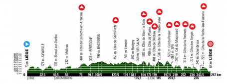 Au menu de Messieurs les coureurs, 257 kms à travers la Wallonie, entre Liège et Bastogne, et retour. Le retour est plus musclé, avec de nombreuses cotes dans les 100 derniers kilomètres: Mont-le-Soie, Wanne, Stockeu, Haute-Levée, Rosier, Maquisard, Redoute, Forges, Roche-aux-Faucons. Plus de 4000m de dénivelé!