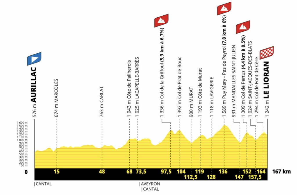 Un mot encore sur les 9e et 10e étapes dans le Massif central, deux étapes piégeuses où tout pourra se passer. De belles étapes (séparées toutefois par un jour de repos), pas un mètre de plat, des parcours usants à souhait.