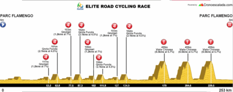 D’une part, en raison du parcours, assez sélectif: 256,4 kms tout de même, une sacré plombe digne des plus grandes classiques de la saison. Le parcours inclut quatre tours du circuit « Grumari », avec deux belles ascensions chaque fois: la Grumari elle-même, 1,2 kilomètres à 7% de moyenne, et des passages à 13%. La Grota Fonda ensuite, 2,1 kilomètres, 4,5% de moyenne mais des passages à 6-7%.