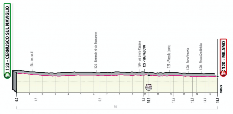 21e et dernière étape, le chrono de 15 bornes vers Milan. Parce qu’un chrono le dernier jour, ca peut toujours créer de sacrés surprises si les écarts sont faibles!