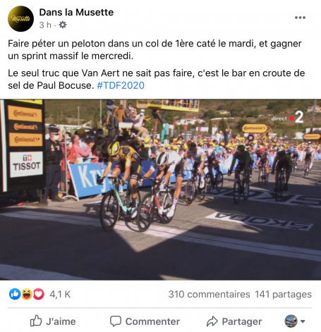 Ouais et d’ailleurs pour changer un peu des pronos tradis (tiercé de l’étape, etc…) on pourrait varier les plaisirs : Par exemple : « classer le trio Sepp Kuss / Wout Van Aert / Primoz Roglic dans l’ordre de celui qui ouvre la bouche en premier pour respirer dans le final du Mt Aigoual (Pour départager les ex-eaquo : A quelle distance de l’arrivée à 100m près)